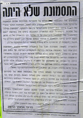 Die Wände Mea Shearims und anderer ultra - orthodox. Viertel sind immer zugeklebt mit diversen Mitteilungspostern, welche PASHKEVILIM genannt werden. Hier die aktuellen davon, welche sich ausschliesslich mit der wegen Kindesmisshandlung verhafteten Mea Shearim Mutter beschäftigen:Der obere Pashkevili: Das Beit Hadassah Ein Kerem Hospital wird verglichen mit den Taten von Dr. Joseph Mengele (Mörder von Auschwitz). Auf dem unteren Teil des Posters wird mitgeteilt, dass das Kind Chaim Yehudah Leib ben Yente Markovitz nach wie vor vom Hadassah Krankenhaus als "Geisel" gehalten wird.